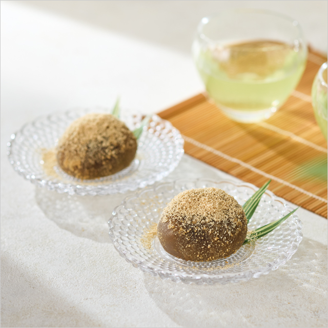 国産本わらび粉を使用し、丁寧に練り上げたわらび餅。もっちりとした食感ととろけるような口当たりが魅力です。中にはなめらかに炊き上げた特製こし餡を包みました。