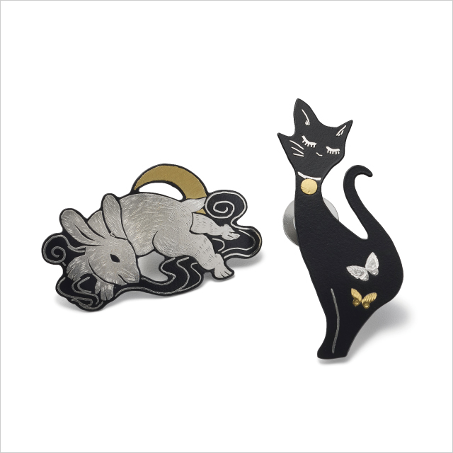 京都の伝統工芸品「京象嵌」の透かしペンダントブローチや、様々な動物のピンブローチの新作が登場。
