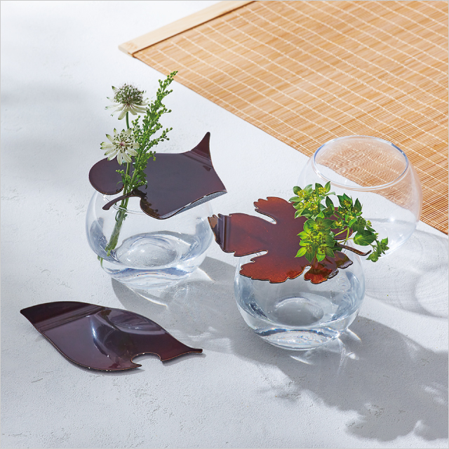 金属の自由な造形と透き漆の美しさを融合させた花器。野に舞い降りた葉をモチーフに、その隙間から草花が息づく情景を演出します。葉のプレートはそのままお皿にもなります。