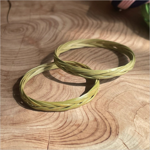 桶を留める竹の箍(タガ)の編み方で、竹のかわいいブレスレットを製作。クラフトバンドで編み方を練習したのち、竹ひごで竹製のブレスレットをつくります。作成する竹のブレスレットと練習用のクラフトバンドのブレスレット、両方のブレスレットをお持ち帰りいただけます。