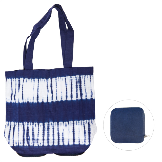 マイバッグ(バッグ本体:綿100%/約34×35×11cm、収納ポーチ:牛革/約13×13×3cm/絞りネイビー) 38,500円〈9点限り〉