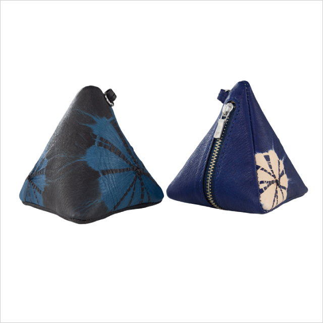 絞り染めされた花のデザインが上品。2枚の革から構成され、小さいながらもファスナーを2面通しにすることでコインケースとしても使えるなど、多用途なポーチです。
