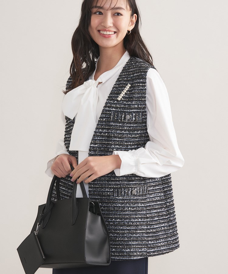 華やかなミックスツイードのジレとボウタイブラウスがセットになった「いまどきハレの日スタイル」が時短で叶うアイテムです。