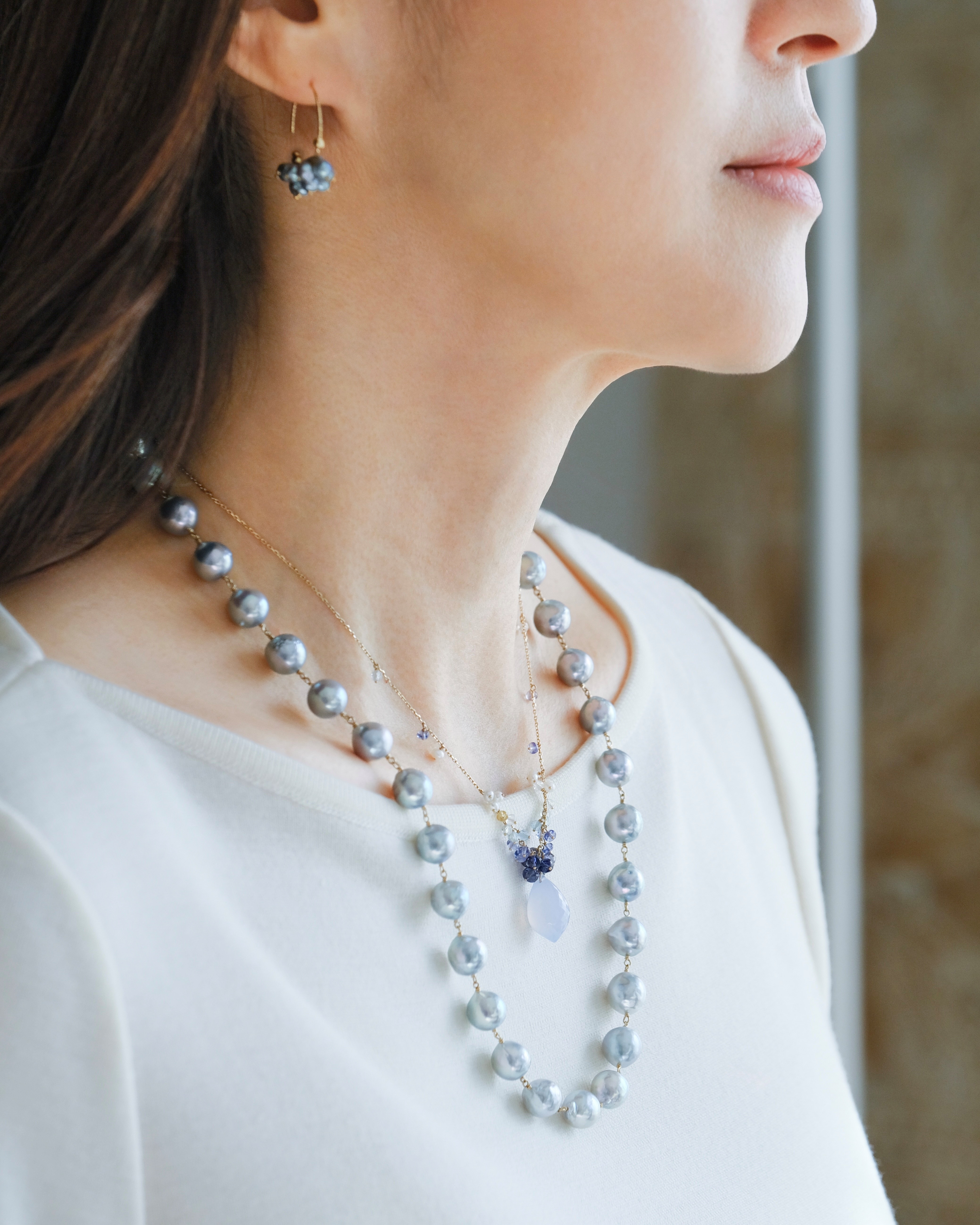 デザイナーが厳選した天然石やパールを主にK10やK18のイエローゴールドで仕立てている〈エーコリーヌ〉。