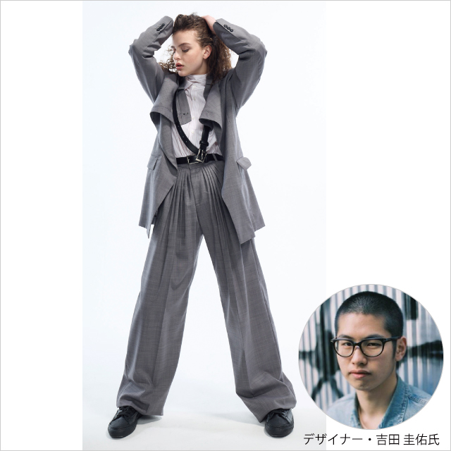 “明るいのか暗いのかわからない空気と、そこにいる彼らの感情と装い”をコンセプトに掲げる〈ケイスケヨシダ〉。片方の襟が長いシャツと、タックによるドレープやサイドポケットが特徴的なワイドパンツに、静かな遊び心が漂います。