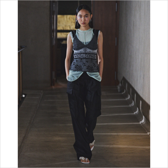 名だたるメゾンでの経験を生かした独自の刺しゅう技法が魅力の、ソウルと東京を拠点に“日常のクチュール”を掲げる〈リブ ノブヒコ〉から、ボタン刺しゅうが目を引くドレスに花影の刺しゅうを施したトラウザーを合わせた、シックなレイヤードスタイルをご紹介。
