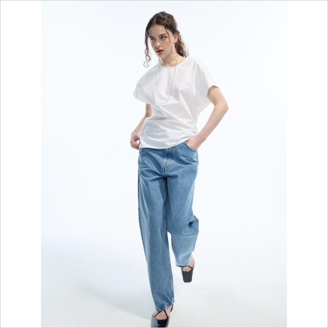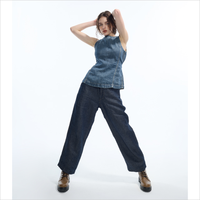 岡山県の老舗デニムメーカー〈クロキ〉の国産デニム生地を使用した、ハイライズのストレートデニムパンツ。オフショルダーのチュニックで抜け感をプラス。