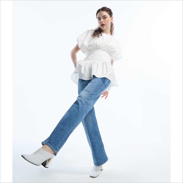 ストレッチ性のある上質な12.83ozのデニム生地を使用したエレガントカジュアルなオリジナルのストレートデニム。スタイルをよく見せてくれるウエストデザインのブラウスは、当店限定カラーとしてサックスブルーをご用意。
