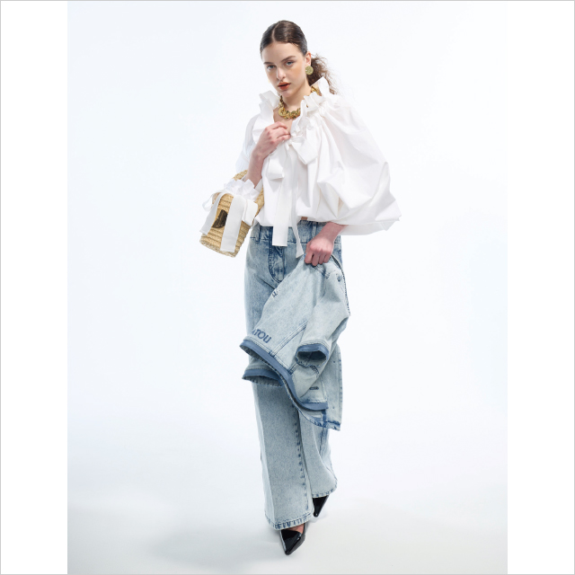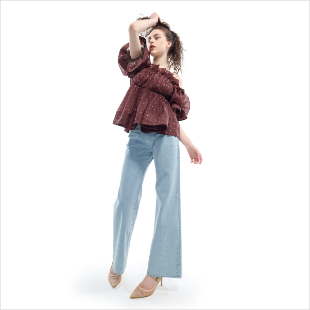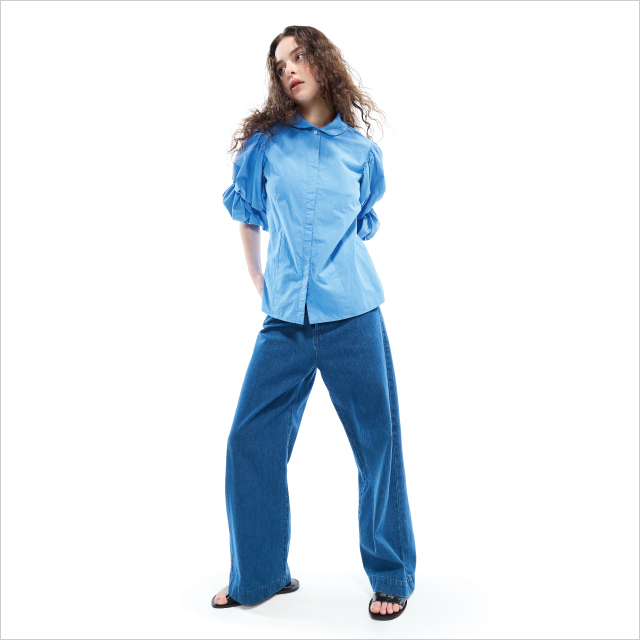 コットン90%、リネン10%の爽やかな素材感が魅力のパフスリーブブラウス。ルーズストレートデニムと合わせた、クリーンなスタイリング。