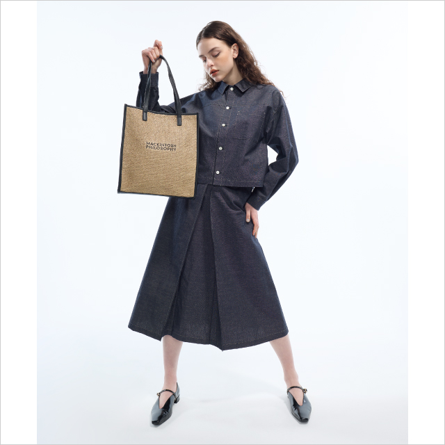 綿麻混の奥行きのある表情が、品よくかろやかな着こなしを叶えるセットアップ。デニム見えのシャツジャケットは、前開き仕様とステッチ使いがポイント。スカートはフロントの大きなインパーテッドタックが特徴的で、足さばきのよいレングスなのでオフィスカジュアルにもぴったり。