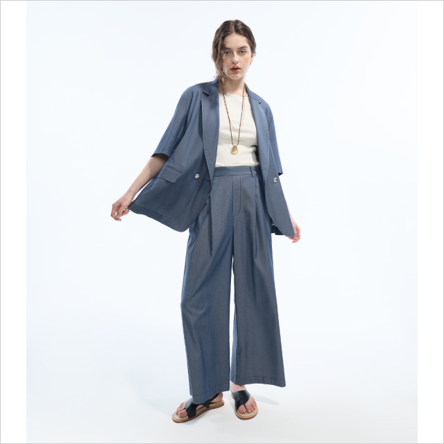 立体的なカーブスリーブとウエストマークがポイントのジャケットに、センタープレスを施したワイドパンツを合わせた、スタイリッシュな着こなし。