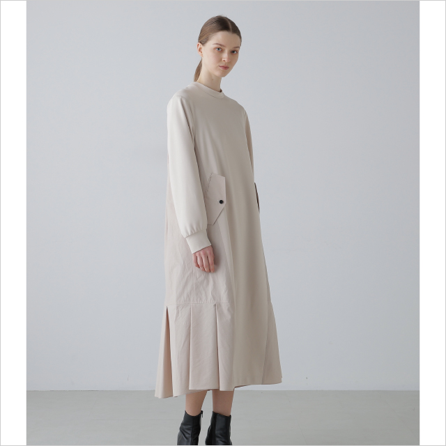 異素材のコンビネーションが目を引くAラインのワンピース。裾に大きめのフレアを入れ、ドロップショルダーにするなど、ゆったりとした着心地とシルエットにこだわりました。前後が異なるデザインで、後ろ姿も印象的。