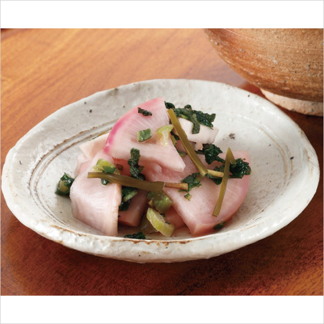 春の七草と旬の赤かぶらを合わせて浅漬けにしました。年末年始のごちそう疲れのお腹を休め、一年の無病息災を願う「七草がゆ」として、ご飯のお供として、あっさりとした味わいでお箸が進みます。