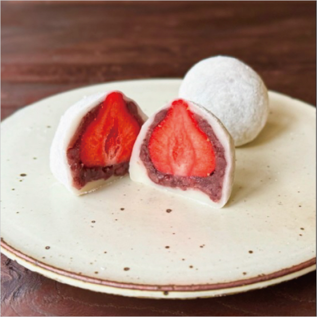 素材本来のおいしさを追求し、銅釜の直火で炊き上げたこだわりのあんと、福岡県産のあまおうをまるごと使用。練乳入りの羽二重餅で包みました。シンプルながら贅沢な味わいのいちご大福です。