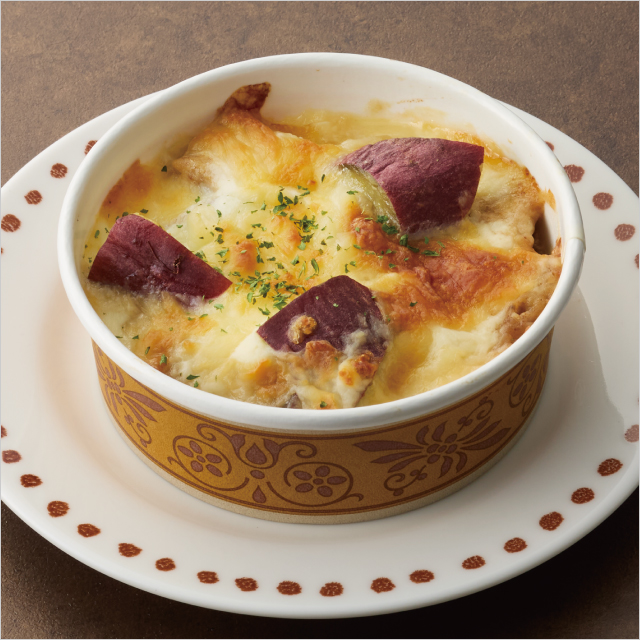 ほくほくのさつまいもとチキン、ベシャメルソースにチーズをのせ、アクセントにほのかにシナモンの香りを添えました。
