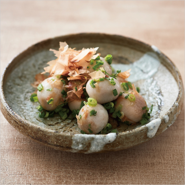 里芋は、だしと砂糖、醤油などでやさしい風味に炊き上げました。だしのじんわりとした旨みが感じられ、鰹とねぎがふわりと香ります。