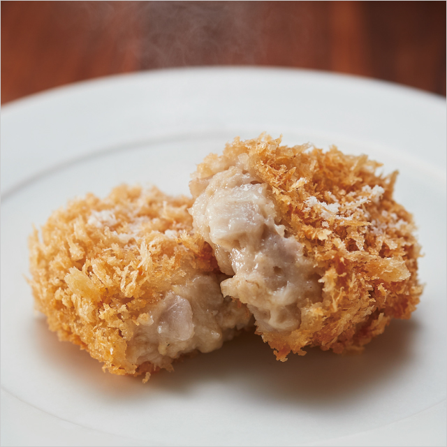 ペーストにした里芋のもっちり感と、角切りのほくほく感が味わえます。だしの風味をベースに鶏ミンチの旨みもたっぷり!トッピングのチーズの香りが効いています。