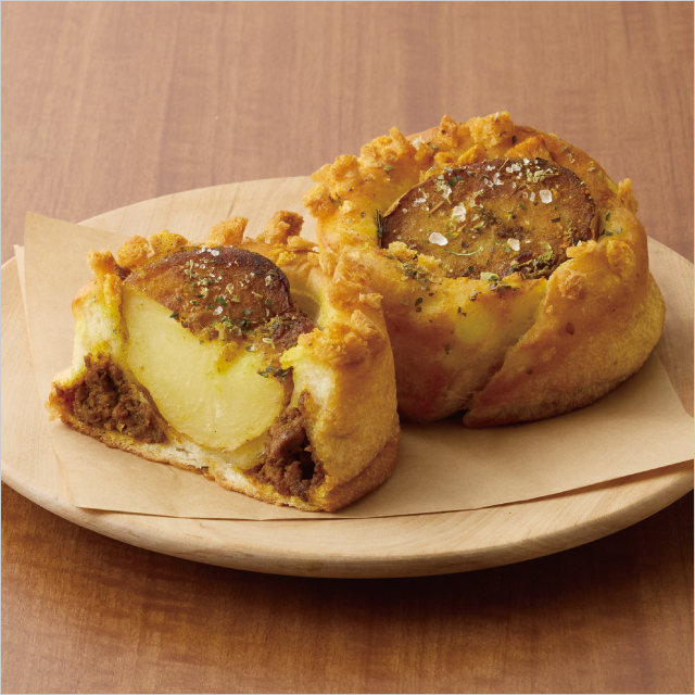 バターをたっぷり染み込ませながらじっくりグリルしたじゃがいもを、スパイスを効かせたカレーパンで包みました。