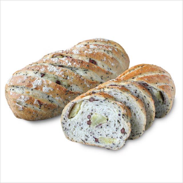 黒胡麻を練り込んだハードな生地に、ゴロッとしたさつまいもと小豆かのこを巻き込んで焼き上げました。歯ごたえのある香ばしい生地と、ほくほくのさつまいもの相性がいい一品です。