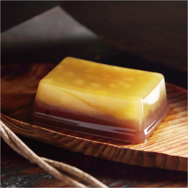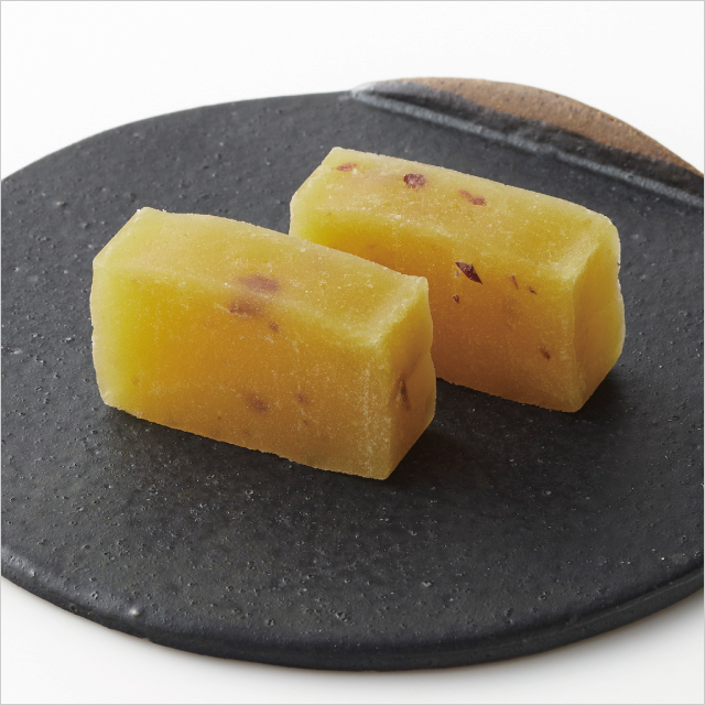 芋羊羹にきざみ栗を混ぜ合わせ、こしあんの羊羹と二層に仕上げました。秋の実りを表現した上品な味わいです。