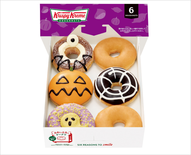 キャラメル パンプキン ジャック、スイート ポテト ゴースト、モンブラン クリーム モンスター。秋の味覚を味わえるハロウィン限定ドーナツに、クモの巣に見立てたチョコ スパイダーと人気のオリグレを合わせたにぎやかな6個ボックス。コワ可愛いドーナツで家族や友人を驚かせよう。