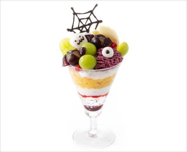 おばけと楽しむハロウィンパフェ!洋梨やシャインマスカットをふんだんに使用した、ハロウィンを楽しむのにおすすめの一品です。