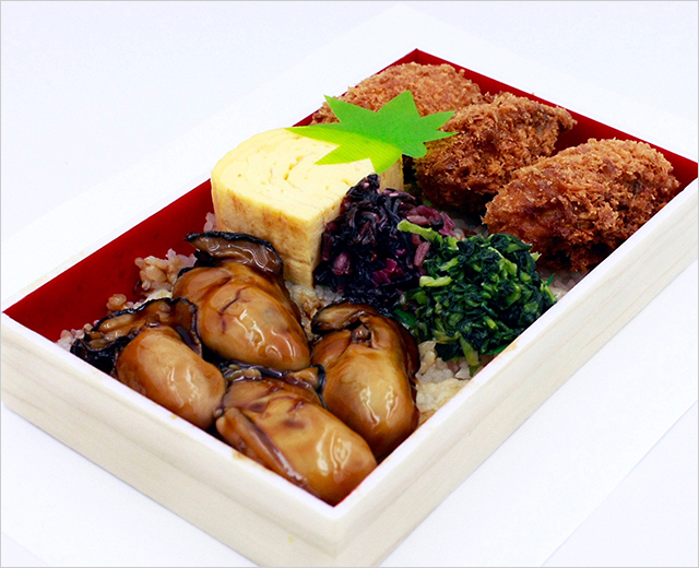 牡蠣の濃厚な旨味が詰まった「かきめし」の上に瀬戸内海ですくすく育ったぷりっぷりの煮牡蠣と肉厚なカキフライが乗ったお弁当です。