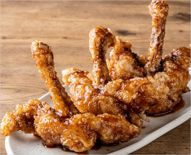 人気の手羽もとは、羽のように広げて揚げているので食べやすい形です。甘辛ダレがたっぷり絡まり、一度食べるとやみつきになります。