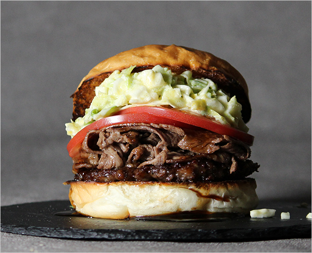 道産牛パティと牛肩ロースにてりやきソース、シャキシャキの春キャベツのコールスローをたっぷりサンドした春を感じる当店限定バーガー。