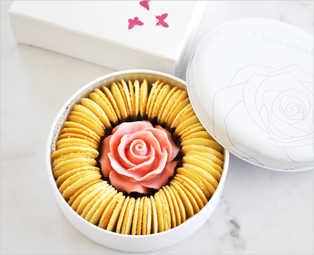 北海道産の生クリームと有機甜菜糖のミルキーでやさしい甘さのラングドシャに、フランス産の素材を使用したベリーの濃厚でほんのり甘酸っぱいローズの可憐なチョコレートをあしらい、華やかな見た目に仕上げました。チョコレートとラングドシャの相性は抜群で、とろける2つの食感をお楽しみいただけます。