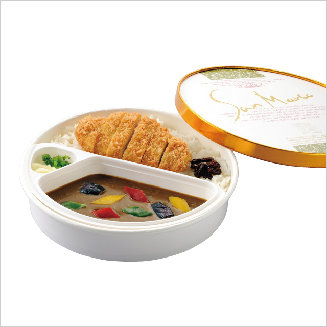 〈サンマルコ〉のオリジナルカレーにフレッシュな豚肉のロースかつをトッピングした、ボリュームのある人気の弁当です。