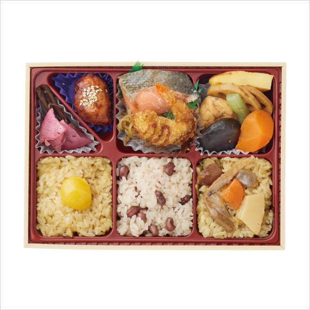 自慢のおこわが3種類と、鮭の塩焼きやエビフライが入った人気のお弁当です。
