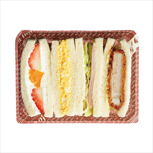 三元豚ロースカツ、いちごとみかんと生クリームなど人気のサンドイッチ4種類のセットです。