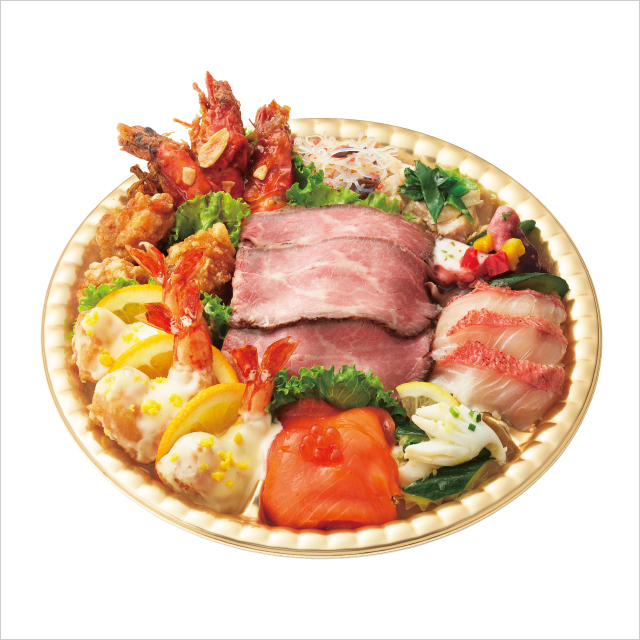 ローストビーフや大海老マヨ、金目鯛サラダなど人気惣菜をたっぷり詰め込んだ、色鮮やかなオードブルです。