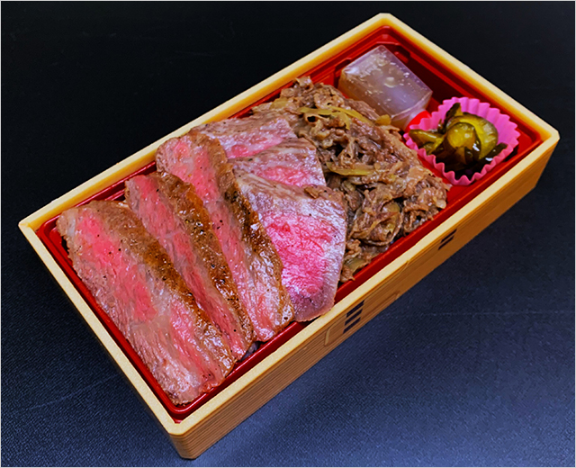 佐賀牛の余分な脂を除き、柔らかく仕上げたすき焼きに、ジューシーなサーロインと、噛むほどに旨味が口いっぱいに広がる赤身ステーキを盛り合わせたお弁当。