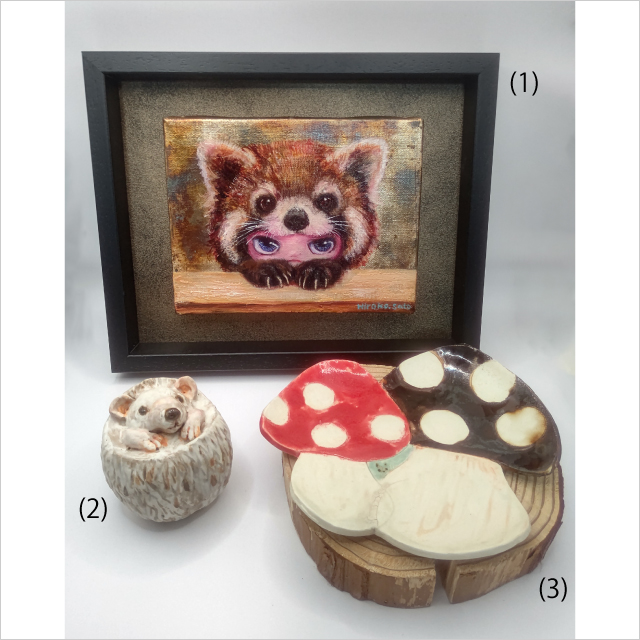 名古屋生まれ。京都市立芸術大学大学院修了。動物やこどもをモチーフにした油彩画や陶板画作品、絵画から飛び出してきたような一点ものの絵皿や、立体作品を展示販売いたします。