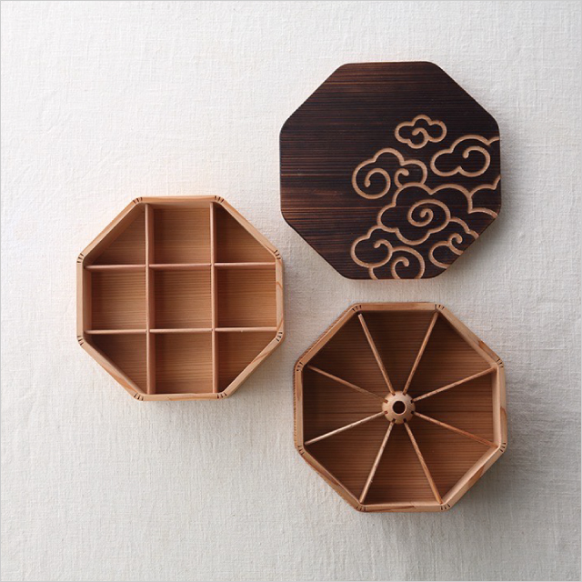 伝統の職人技とこだわりの杉材で料理木箱をはじめとする木製品を手掛ける、明治元年創業の〈箱屋常吉〉。上品な八角二段の大きな弁当箱は、木の調湿効果と抗菌効果が特徴です。仕切りは取り外し可能で、蓋は白木の白刻と焼杉の黒刻の2色から選べます。