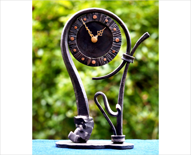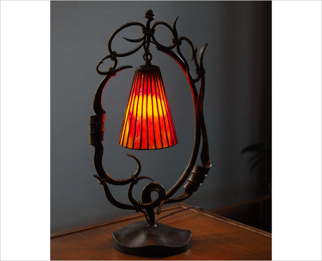 1957年京都府生まれ。鉄をコークスの炎で熱し、ハンマーで鍛える作業の繰り返しの中から生み出される風合いと、文様が美しいランプやオブジェ、飾り筥など約60点を展示します。