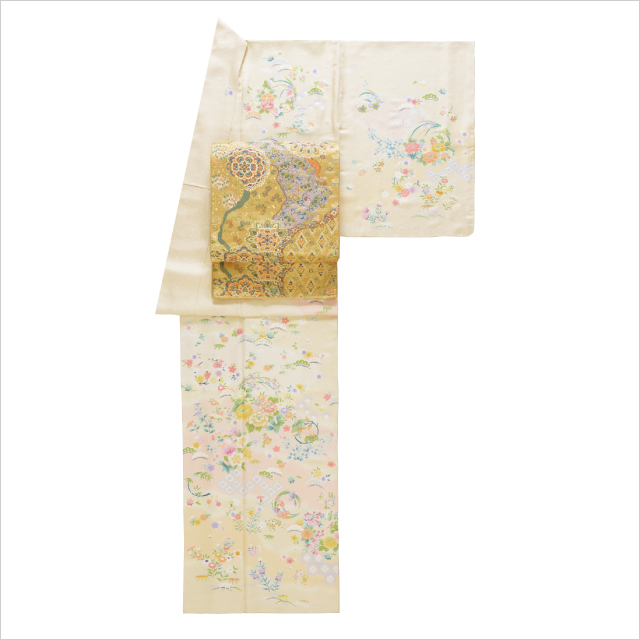 春天特有的柔和的奶油色和鮮豔的花紋美麗的訪問服和金帶子合在一起,給人一種豪華的印象。