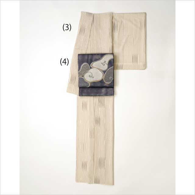藏青地的綢緞,加上波紋的帶子給人一種涼快的印象。從初夏到秋老虎季節都可以穿。
