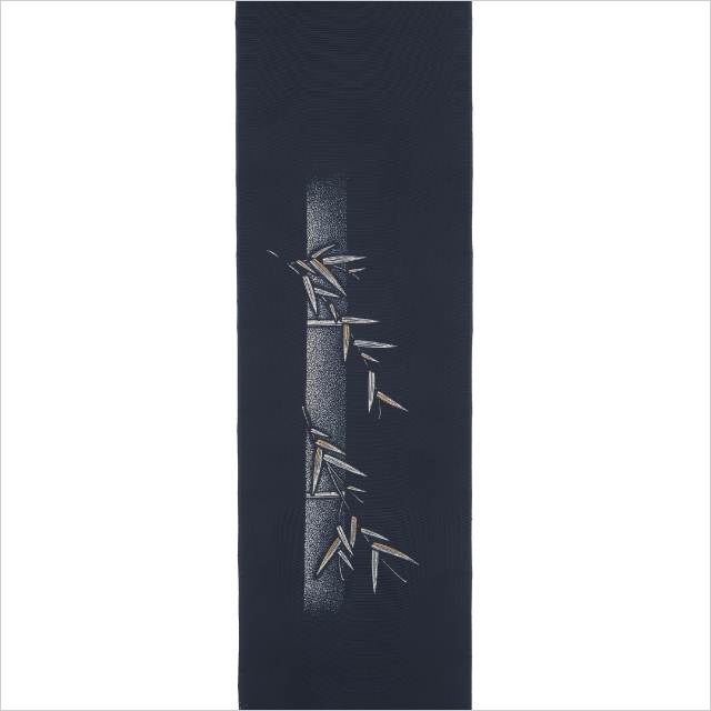 以檜垣圖案為主題,幾何美令人印象深刻。用PLATINUM箔和金絲在織布組織上下功夫,根據角度的不同,金和銀都能看到,這是其魅力所在。是與工藝性的和服相配的帶子。