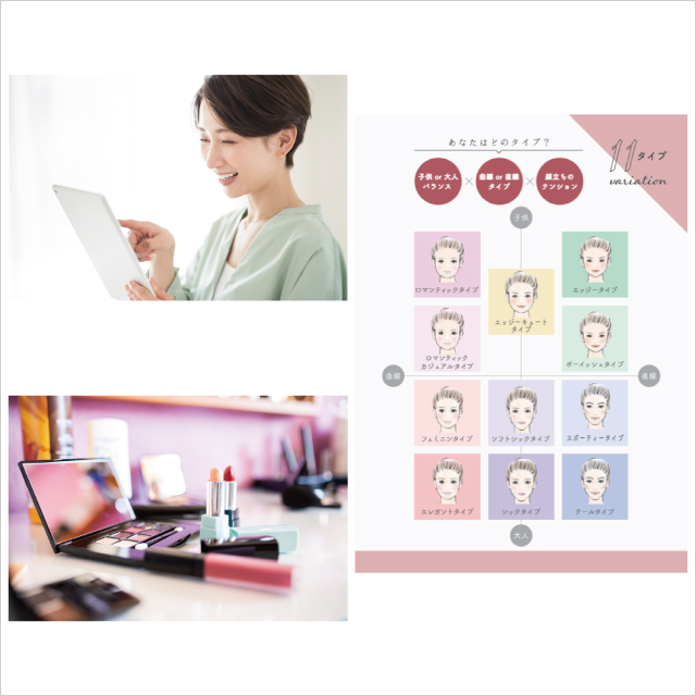 用專用的診斷系統量測約20處臉型,以“適合的理論”為基礎,從全部11種類型的“適合的化妝”和“想成為的化妝”的方案。