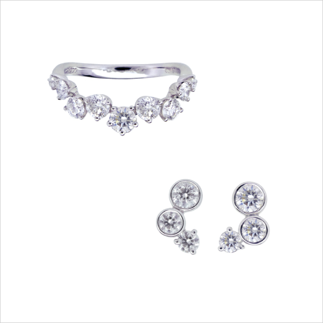 戒指和耳環排列著具有設計性的鑽石。鑽石閃耀著白色的光芒,簡單卻散發著存在感。