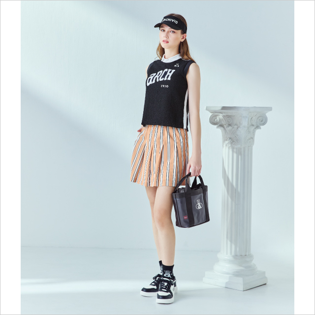 帶有品牌標誌的黑色無袖搭配,配上米色條紋圖案的裙子,搭配別致的搭配。