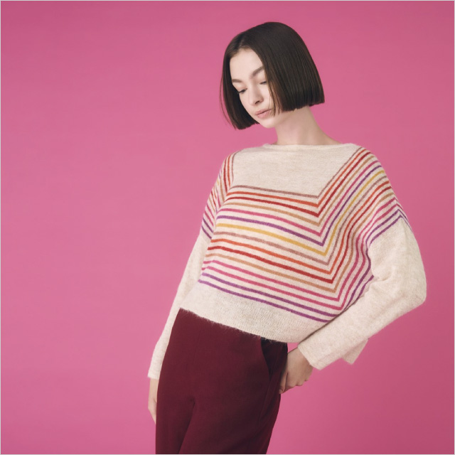 以有毛腳的空氣性素材為基礎,加上多色配色的藝術針織衫。這是一款在超大型的Silhouette道具上加上藝術圖案而變化的、充滿講究的針織衫。