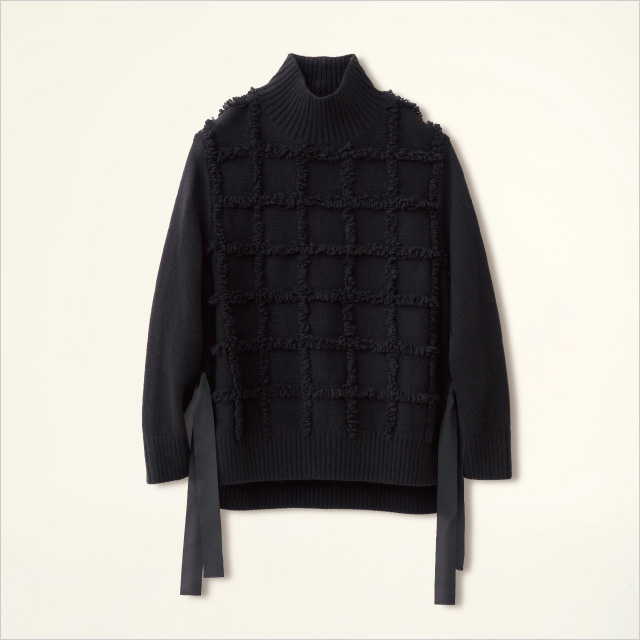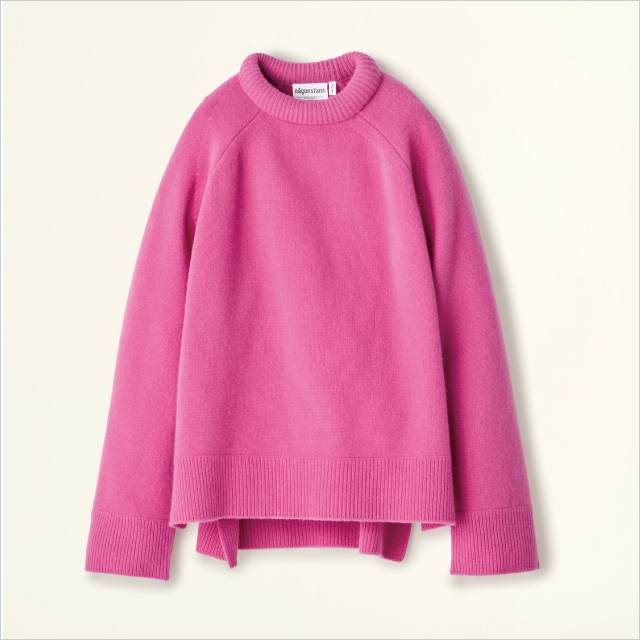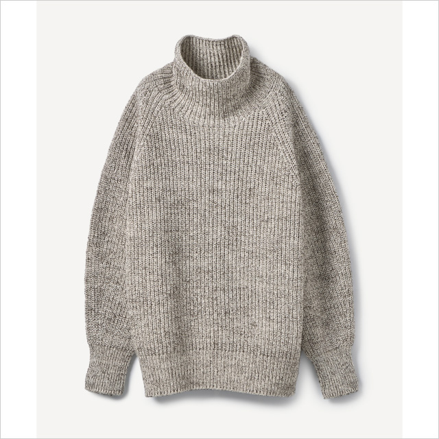將有機棉和羊駝、羊毛混合而成的線織得鬆軟,完成了柔軟的手感。寬敞舒適的高領和立體的袖子,營造出輕鬆的氛圍。