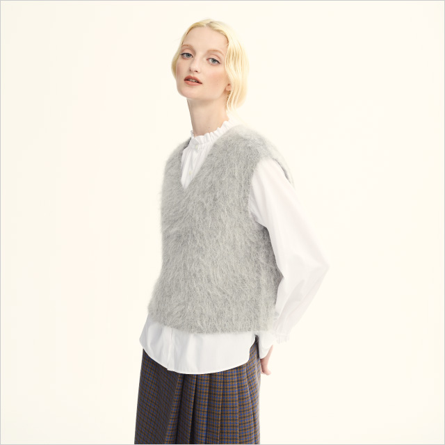 在混合了羊駝的素材上進行了沙基加工,表情鬆軟的緊湊型V項鏈背心。搭配襯衫,給人以溫柔的感覺襯托出女人味的印象。